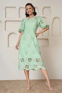 A charming Sage green midi dress featuring a delicate broderie anglaise design. This dress has short, puffed sleeves and a flattering silhouette, perfect for a sophisticated and stylish look.