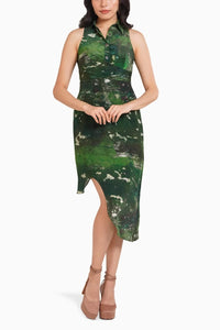A sleeveless dress featuring a structured collar and asymmetric hem, crafted in a fluid silhouette that flatters the form. A contemporary take on feminine tailoring.