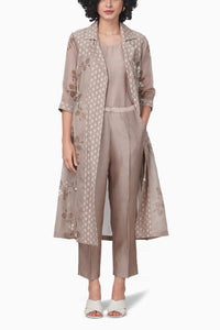 Featuring a sakura print jacket in stripe organza and straight pants in silk chanderi.