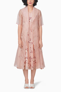 Featuring a solid organza jacket with scalloped collar sakura print dress in silk chanderi.