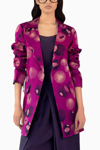 Elevate your wardrobe with our Sakura Silk Jacket. Crafted with our statement print on a luxurious magenta modal satin, this jacket is a true work of art. Designed with tie details on the cuff, it effortlessly elevates any casual look to a sophisticated and exclusive one. Dress up with ease and make a statement with this must-have piece.