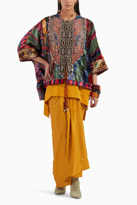This stunning ensemble features a printed and embroidered loose boxy jacket paired with a textured solid-colored relaxed fit short trapeze kurti with inserts. The jacket showcases intricate embroidery and tribal tassel details, adding an artisanal touch. The easy-fit kurta offers comfort and effortless style, while the textured solid-colored pleated skirt with an elasticated waistband ensures a flattering and secure fit.