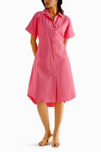 Effortlessly chic, this cotton midi dress exudes timeless elegance with its attached belt, offering a perfect blend of style and comfort for any occasion.