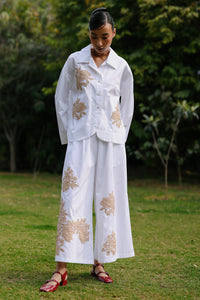 Featuring the Salt and Sand Co-ord Set by Trisara's Fuss Over Me Collection. This white cotton set with beige lace features a round-cut shirt adorned with lace applique, offering a straight, loose-fit silhouette for a relaxed and elegant look.