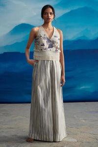 Introducing our latest creation: a stunning v-neck top expertly crafted from hand-screen printed chanderi fabric. This exquisite piece blends traditional artistry with contemporary style, promising both elegance and comfort. Pairing perfectly with our new creation is our boyfriend-style pants. Featuring front pleats, side pockets, and a generously wide leg, these pants are designed for both sophistication and ease. Discover the art of modern luxury with our meticulously curated ensemble, where craftsmanship meets effortless chic.