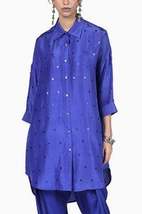 An exemplary shirt, the Samar Shirt is a number one effortlessly. Scattered with hand embroidered rhinestone all over with unique placement , the shirt is a mid thigh length and has full sleeves with a very minimal pleat detail on the back .Its Our definition of a seasonless shirt.