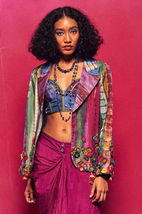 A stunning silk tie-dye panel patchwork blazer adorned with hand-crocheted flowers and complemented by playful tassel detailing. This unique piece combines artistic craftsmanship with vibrant colors, making it an eye-catching statement for any occasion, perfect for adding a touch of bohemian elegance to your wardrobe.