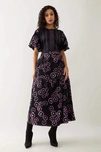 Samui Set in a charming farm print, blending intricate details with a playful yet refined aesthetic. The shirt features a round neckline and voluminous double-layered puff sleeves, accentuated with delicate running stitch details. Pleats on the yoke add subtle texture, while the print placement—limited to the sleeves—harmonizes with the fully printed skirt. The skirt boasts a paneled construction with a soft gathered effect, front gathered pockets for both style and function, and delicate bow accents for a whimsical touch. A concealed black zipper ensures a seamless finish. Style this set with woven bag for an effortless daytime look.