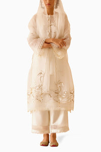 The Samya Kurta Set is a masterful blend of elegance and innovation, elevated by contrasting lace details. This bestselling silhouette is refreshed with signature Chintz-inspired floral motifs for the season. The set features a 100% silk organza kurta and dupatta, a shantoon slip, and viscose silk wide-leg pants. With bell 3/4 sleeves and a round neck with a front button placket, it offers a sophisticated and modern charm.