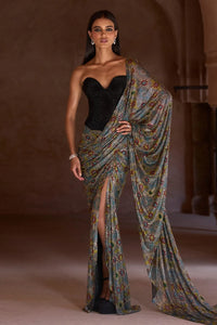 Solid Black Crystal-embellished corset paired with a silver floral print draped skirt and detachable pallu.