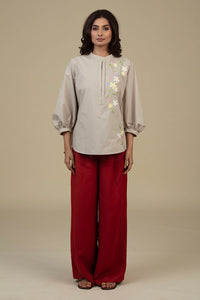 A striking interplay of structure and softness, this shirt is crafted in lightweight cotton. A crisp beige front panel is elevated with multicoloured floral embroidery, while the voluminous sleeves and back introduce movement and intrigue, lending a fresh edge to the silhouette.