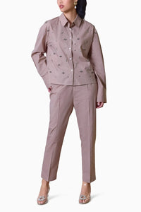 A chic beige button-down shirt adorned with delicate crystal embellishments for a subtle yet sophisticated shimmer. Perfect for elevating everyday wear or adding a touch of glam to evening ensembles.