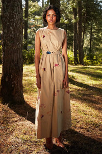 This jumpsuit in Khara Kapas’ signature khaki floral print features a belted waist for a snug fit, back zipper detailing, and front pleats for a touch of elegance. The soft khaki brown color adds a timeless appeal, while side seam pockets offer practicality. A sophisticated yet comfortable piece, perfect for both casual and semi-formal occasions.