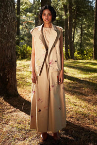 This jumpsuit in Khara kapas’ signature khaki floral print offers a chic, elegant look with a belted waist for a flattering fit, back zipper detailing, and front pleats for added sophistication. Paired with the floral bolero safari jacket, featuring a relaxed fit and double-sided print, this versatile ensemble combines style and comfort. The jumpsuit also includes side seam pockets for practicality, while the rich khaki brown color enhances its timeless appeal. Perfect for both casual and dressed-up occasions.