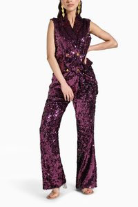 Featuring a sleeveless sequins double breasted blazer with gold metal buttons, paired with straight pants.
