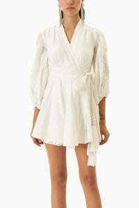 Made in Cotton Silk Blend this Wrap dress is inspired by hues of Santorini. The Dress has romantic sleeves with 3D tonal embroidered flowers set in between beautiful hand knotted French knots. Beautifully Fitted till the waist the style then is cut in full circle adding volume to the bottom. The wrap belt is further enhanced with self made thread tassels and beads.  style this dress with strappy sandals and you are ready for the nice brunch look.