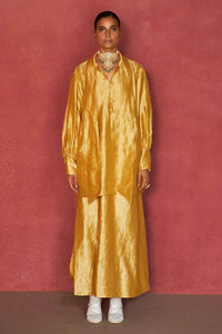 The Sanyogita Gold Kimkhwaab Set exudes regal allure, featuring a Victorian-inspired blouse with bow-tie detailing and voluminous sleeves, paired with the sultry Tara Brocade Skirt. Handwoven in Banaras over months from pure silk and gold-plated zari, this kimkhab tanchoi ensemble is a timeless statement in heritage craftsmanship and opulence.
