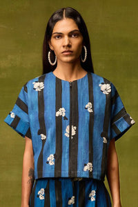 This boxy crop top designed in hand-drawn blue and black striped print with delicate floral motifs, zipper closure, short sleeves with a cuffed hem, and sequin-tassel embellishments for a playful yet edgy finish. Perfect to elevate casual outfits or style with matching trousers for a co-ord statement.