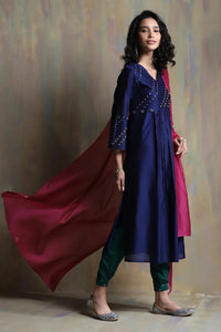 Featuring a Chanderi kurta with mirror-embellished bell sleeves and intricate mirror work on the yoke. This elegant kurta set is paired with a Chanderi dupatta, highlighted with mirror embellishments along the border, and stylish cotton joggers adorned with mirrors, offering a contemporary and fashionable twist on traditional wear.