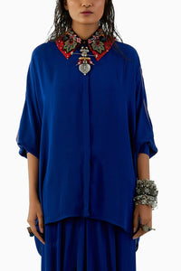 Indulge in the Sapphire Mandala Shirt, an anti-fit marvel. Crafted from natural crepe, this shirt boasts an intricate mandala design complemented by an embroidered collar adorned with exquisite Zari Marodi embroidery, all in a stunning Sapphire hue.