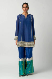 A delicate blue organza short kurta, crafted in a lightweight silhouette and embellished with pearls and fine embroidery. The design features a sapphire-hued arch outline, inspired by Mughal architecture, adding a touch of regal charm. Perfect for festive gatherings, intimate celebrations, and modern ethnic styling, this designer kurti combines youthful elegance with timeless craftsmanship.