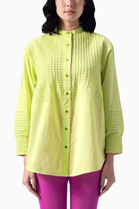 The SapproShirt in pear coloris a luxurious cotton satin shirt with intricate pintuckdetailing, hand embroidery, and signature beetle embroidery below the back yoke.