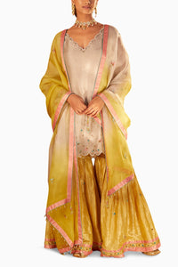 A short organza kurta featuring zardozi embroidery, bullion knots, swarovski stones and scalloping across the neckline, sleeves and hem. Paired with a complimenting tissue gharara and organza dupatta.