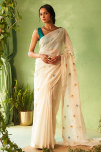 Featuring an off-white Chanderi saree adorned with colorful embroidered palm tree motifs all over, finished with intricate cut dana edging, and paired with a contrasting color blouse for a striking look.