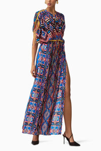 Featuring Sasha Ikat Print Kaftan by Saaksha & Kinni, this elegant kaftan showcases an Ikat-inspired print with a drawstring waist, adjustable drawstring sleeves, and customizable side slits. Perfect for a chic, relaxed look with a personalized fit and stylish details.