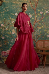 Elevate your contemporary ethnic wardrobe with our Cape Sharara Set, featuring a heavily embroidered sleeveless net blouse paired seamlessly with an Organza Sharara. The ensemble is adorned with exquisite details, including an embroidered waistband on the sharara and a stunningly embroidered Organza cape. This set effortlessly combines tradition with contemporary style, making it an ideal choice for weddings, festive occasions, and special celebrations. The intricate embroidery and thoughtful design ensure a look that's both elegant and fashion-forward, promising to turn heads at every event. Embrace the charm of this ensemble and make a stylish statement wherever you go.