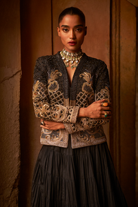 Featuring Savannah Blazer by The House of Exotique. Adorned with golden lurex, full sleeves, and intricate zari dabka Zardozi work, this single-hook blazer epitomizes opulent sophistication.