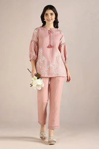 Featuring the Savannah Kismat Blush Co-ord Set in 100% linen, this comfort-fit ensemble highlights a mandarin collar top with hand-embroidered doodle art and 3D cotton thread embroidery. Adorned with intricate hand-cut details and a pearl handmade tassel, it blends elegance with relaxed style.