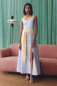 Breezy, bold, and effortlessly feminine this striped cotton dress is your perfect summer statement. Featuring a flattering scoop neckline and a gently flared silhouette, its designed with fine blue and white pinstripes that bring a crisp, tailored feel to a flowy cut. The high side slit adds movement and a touch of allure, while the detachable lemon-yellow sash cinches the waist for a playful pop of color. Made for sun-drenched days and golden hour soirées alike.