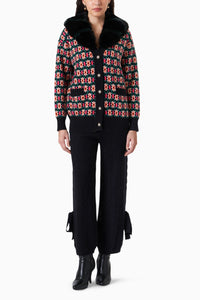The Savoy co-ord set made in a gorgeous colour way of black, forest green and hues of pink- will be your go to outfit for those smart winter nights ( out or in). The Savoy cord set has a button up silhouette and is made in Miri’s signature super soft wool blend. The detachable faux fur collar will give you that effortlessly elegant & chic look. The coordinating black pants are in a cable knit design with a tie up bow on the sides !