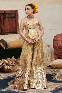 Gold mirror work sharara on lampi with intricate mirror embellishment on bottom, the sharara is paired with a mirror work corset blouse on gota lined with chanderi silk and red dupatta with mirror work.