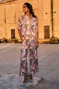 Delicate cutwork floral lace in tones of lavender and fuchsia with grey accents. Boxy lace top has scalloped hem, fuchsia fabric detailing on the collar and cuff. Band collar, cropped sleeves. Popover top with concealed hook and eye buttons. Comes with a slip. Paired with matching straight pant that has a scalloped hem, fuchsia fabric detailing on the waistband and side seams. Hook/eye and zip closure in the front, pockets in the sides. Garment is fully lined.