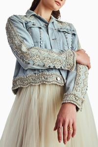 Featuring the Scalloped Lace Jacket by Roseroom, this light blue washed denim jacket boasts scalloped lace borders with intricate hand-embroidered embellishments. Adorned with studs for a unique style, it blends elegance and edge perfectly. Crafted from premium washed denim.