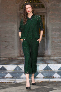 Intricate lace top with intricate floral detailing. Contrast black flocking on the surface with a textured lace layer over a floral lace base. Concealed popover placket with a band collar. Drop shoulders, cropped sleeves with satin contrast cuffs and placket. High-low scalloped hem with slits in the sides. Relaxed, Boxy fit. Comes with a slip. Paired with straight fit pant in deep emerald lace. Contrast black satin cut and sew panel down the side seams. Scalloped hem. Structured waistband. Concealed zipper with hook/eye closure. Pockets in the sides. Garment is fully lined.
