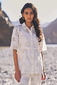 Relaxed fit top in knitted floral lace fabric. Scalloped crop sleeves and hem. Shirt collar with front button down placket. Comes with a waist tie. Made in lightweight, breathable fabric. Includes a matching slip.