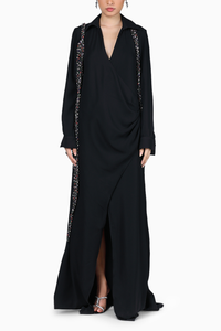 Featuring Scarlet Black Dress by 431-88 Shweta Kapur from The Popsicle Collection. This is delicately crafted in a crepe and is designed with curved panels to fit the body perfectly. It features long sleeves and a slightly flared hem. Enhanced with a slit in the front, that makes it a sexy dress that serves looks.
