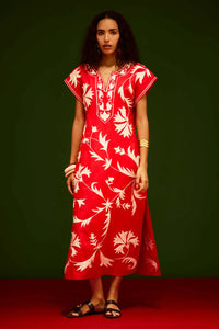 Featuring the Scarlet Maxi Dress with Ivory Garden Thread Embroidery, a relaxed-fit design in cotton poplin. Delicate ivory garden-inspired embroidery adds a soft contrast to the bold hue, creating a striking yet graceful statement piece.