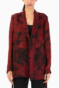 Trans-seasonal layered jacket in hand dyed surface design. Crafted in luxurious silk with inside seams thouroughly piped in silk. The jacket comes with side lace-up belts, inseam pockets and a layered bodice. Features precise tailoring and hand sewn construction techniques.