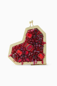 A flaming red heart made of chunky rubies and a mix of dabka and zardozi embroidery. The geometric metal frame holds crystals of different shapes and sizes on luxurious red fabric. If you’re falling in love, don’t worry, we did too. That’s why the heart—it’s a declaration of our love for this stunning accessory. It’s packed with opulence and yet doesn’t fail to be dainty and chic.