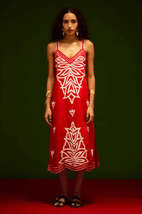 Featuring a scarlet strappy cotton dress with ivory flame thread embroidery, this relaxed-fit piece is crafted from cotton poplin, blending bold color with breezy elegance for effortless day-to-night style.