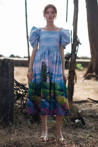 Introducing our Scenery House Off-Shoulder Puff Sleeve Dress, a cozy blend of home-inspired charm and relaxed elegance. With its scenic valley print and soft fabric, this dress evokes feelings of warmth and nostalgia. The off-shoulder puff sleeves and flare calf-length design add a touch of whimsy and sophistication. Perfect for lounging at home or casual outings, it offers both style and comfort in equal measure, making it a delightful addition to any wardrobe.