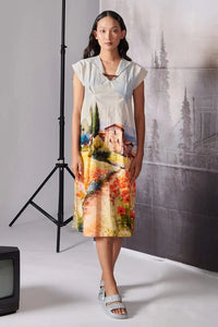 The Scenery House Dress captures the essence of home and comfort in its charming design. Featuring a scenic house print, this dress evokes feelings of warmth and nostalgia. With its relaxed silhouette and soft fabric, it's perfect for lounging at home or casual outings. The scenic house print adds a touch of whimsy and charm, making it a unique and delightful addition to any wardrobe. Whether you're relaxing indoors or enjoying a leisurely stroll, this dress offers both style and comfort in equal measure.