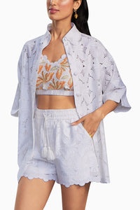 Off white schiffli 3-piece set featuring a bralette, shorts & shirt.