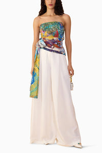 Featuring the Scribble Dense Amina Blouse and White Saylor Palazzo by Saaksha & Kinni’s Akara Collection A/W'25. Strapless asymmetric blouse with side bow and scribble print, paired with wide-leg palazzos- avant-garde femininity in motion.