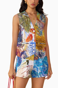 Featuring the Scribble Dense Ember Waistcoat with Shorts by Saaksha & Kinni's Akara Collection A/W'25. Button-down abstract scribble print waistcoat paired with high-waist shorts with pockets- smart, modern separates with playful print.