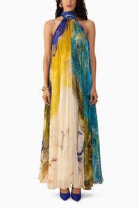 Featuring the Scribble Dense Stella Dress by Saaksha & Kinni's Akara Collection A/W'25. This halter neck flowy maxi dress in abstract scribble print exudes effortless elegance, blending fluid movement with a bold, expressive design perfect for transitional styling.